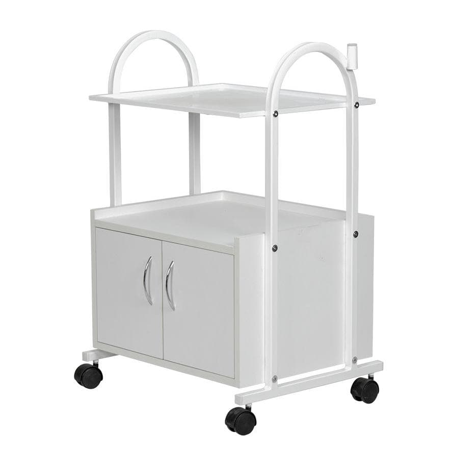 Купить косметологическую тележку МД-103 можно в нейтральном белом цвете, который будет сочетаться с любой палитрой помещения и базового оборудования. Полка и элементы каркаса выполнены из прочного металла, окрашенного защитной краской. Шкафчик выполнен из качественной ДСП с влагоотталкивающим ламинированным покрытием. Для удобного перемещения модель комплектуется вращающимися колесами из прочного пластика.Характеристики