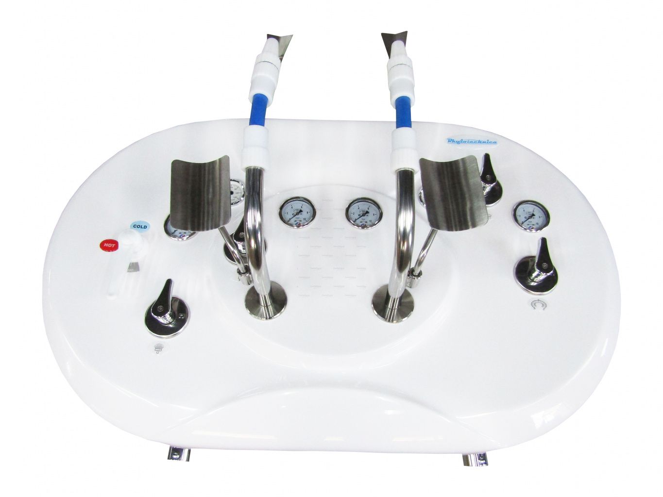 Рабочее давление и расход воды каждой из терапевтических процедур регулируется с помощью манометра и соответствующего крана подачи воды. Требуемое давление в подводящих трубопроводах составляет 5-6 атм.