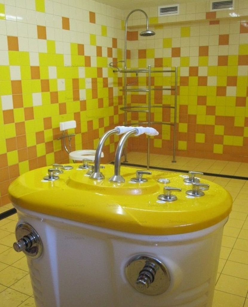 - Циркулярный душ: Позволяет проводить точечный массаж всего тела пациента. В случае правильного выбора температуры воды с помощью смесителей, находящихся на кафедре, душ оказывает возбуждающее действие на центральную нервную систему, улучшает кровоснабжение кожных покровов. Оптимальное давление для данной процедуры – 1,5 атм. Температуру воды постепенно понижают с 36°С при первых процедурах до 25°С к концу лечения.