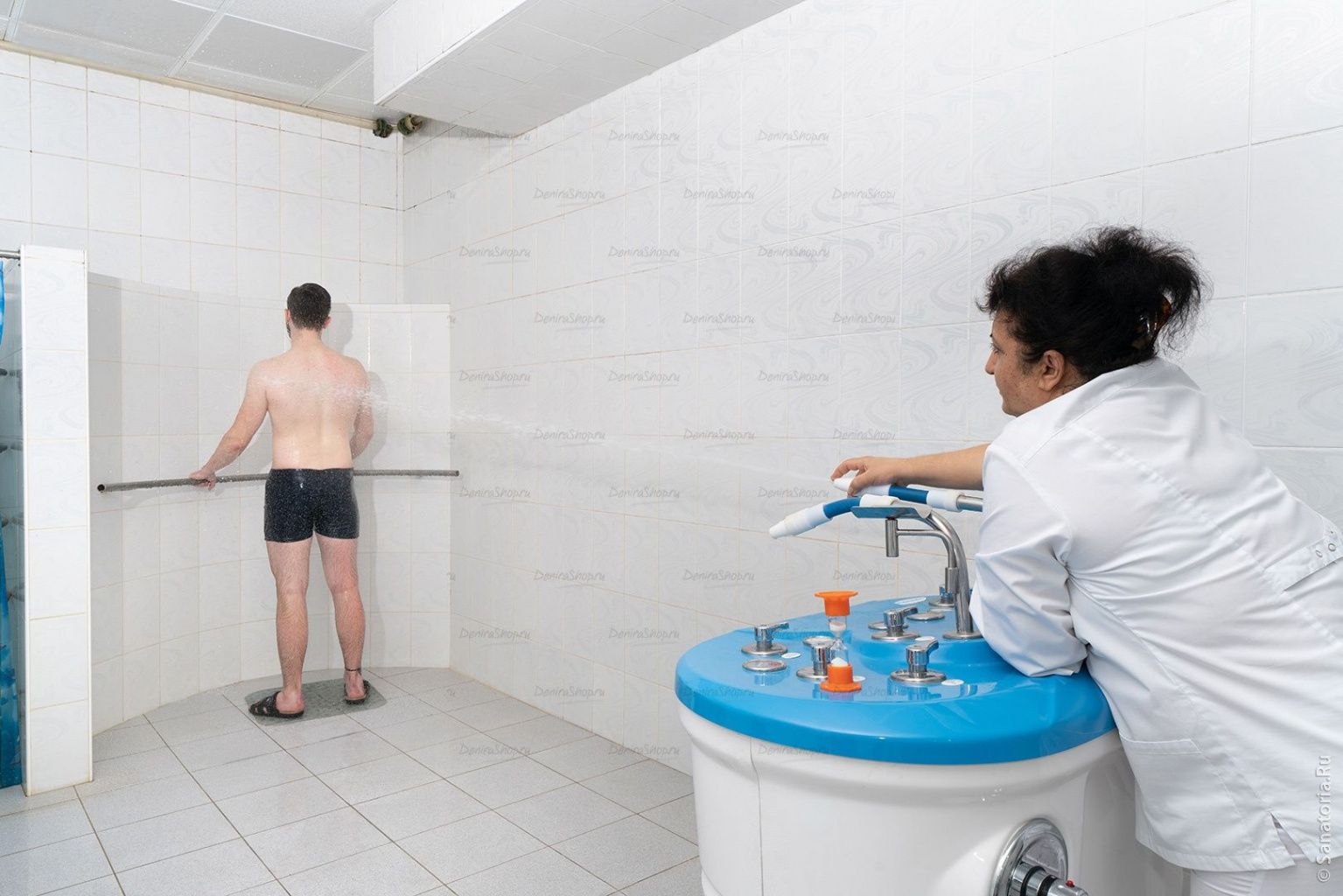 НАЗНАЧЕНИЕ ПРОЦЕДУР:- Струевой душ (Шарко): Пациент стоит на расстоянии 3–4 м от душевой кафедры. Струю воды направляют на тело пациента снизу вверх: сначала веерной, а затем компактной струей под давлением 2–3 атм. Живот массируют при давлении 1,5 атм круговыми движениями по часовой стрелке. Данная процедура позволяет улучшить кровообращение поверхности тела, оказывает влияние на мышцы, положительно влияет на центральную нервную систему и обмен веществ в организме.