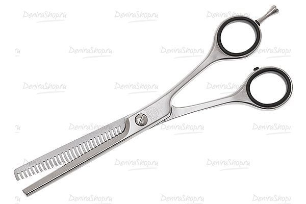 Зубцы особой формы обеспечивают более мягкий выход из пряди волос. Ножницы изготовлены из закалённой нержавеющей стали высокой твёрдости. Форма ножниц классическая. В комплекте съёмные пластиковые кольца и упор для мизинца.