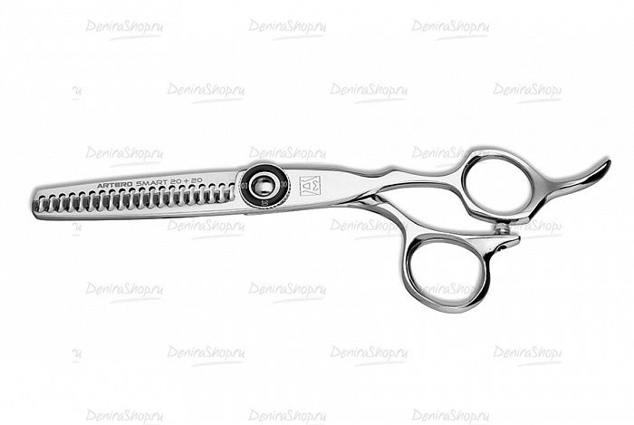 Парикмахерские ножницы филировочные Smart T63960 от испанского бренда Artero оснащены двумя филировочными кромками, каждая из которых имеет по 20 зубцов, и регулируемой системой натяжения полотен, благодаря которой можно изменять количество срезанных из пряди волос от 10 до 30%.