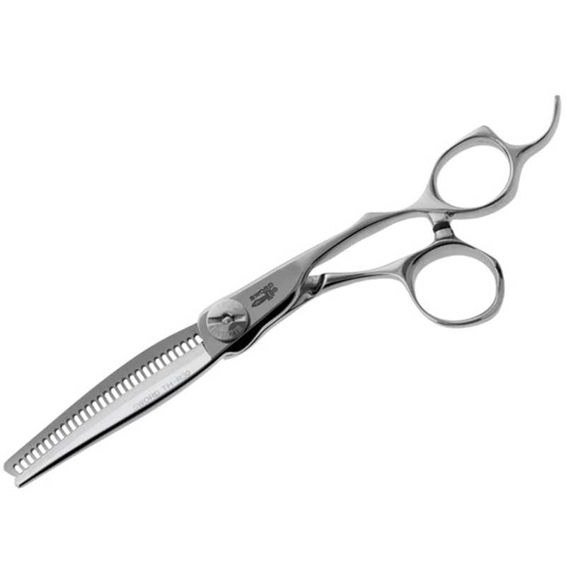 В серию производства ножниц SWORD была заложена существенная идея, направленная на наличие удобного комфорта парикмахера при работе с клиентами. Представленная модель филировочных ножниц SWORD THINNING на базе модели D-17 снабжена особенной формой из тридцати зубцов дугообразной формы, которые осуществляют мягкий срез, за 1 шаг, снимая более 40% волос. Легкое скольжение по волосам придает дугообразное нижнее лезвие ножниц. Режущие формы полотен "меч хамагури" в моделях D-17, имеющие дизайнерскую японскую уникальность, позволяют осуществлять любые приемы в технике профессиональной стрижке, при этом создавая свободное, комфортное положение руке мастера. Износостойкая втулка, созданная на основе материала "carbonresin", являющая запатентованным изделием из винтовой группы, снабжает натяжение полотен ножниц точнейшей регулировкой, легкостью и мягкостью хода, а также обеспечивает точность среза. Мелкий шаг хода ножниц регулируется на основе системы MINIKLIK.