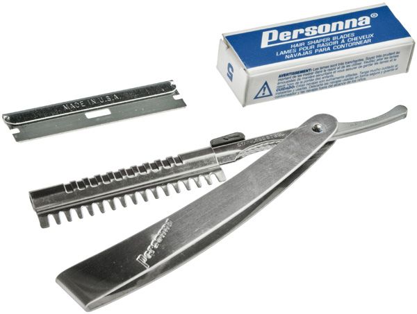 Складная опасная бритва из нержавеющей стали с филировочной насадкой. В комплекте упаковка лезвий из пяти штук.